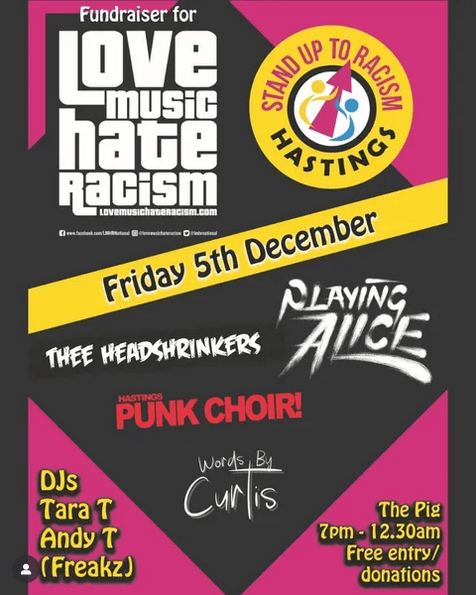 Hey, Hastings. What a lineup we’ve got for you at our Love Music Hate Racism fundraiser for Hastings Stand Up to Racism. Help fund leaflets, posters, and room hire to organise against the far right – stand with refugee, migrant, Muslim, LGBT+ and disabled communities under attack! Come dance, celebrate diversity, and stop the hate ❤️